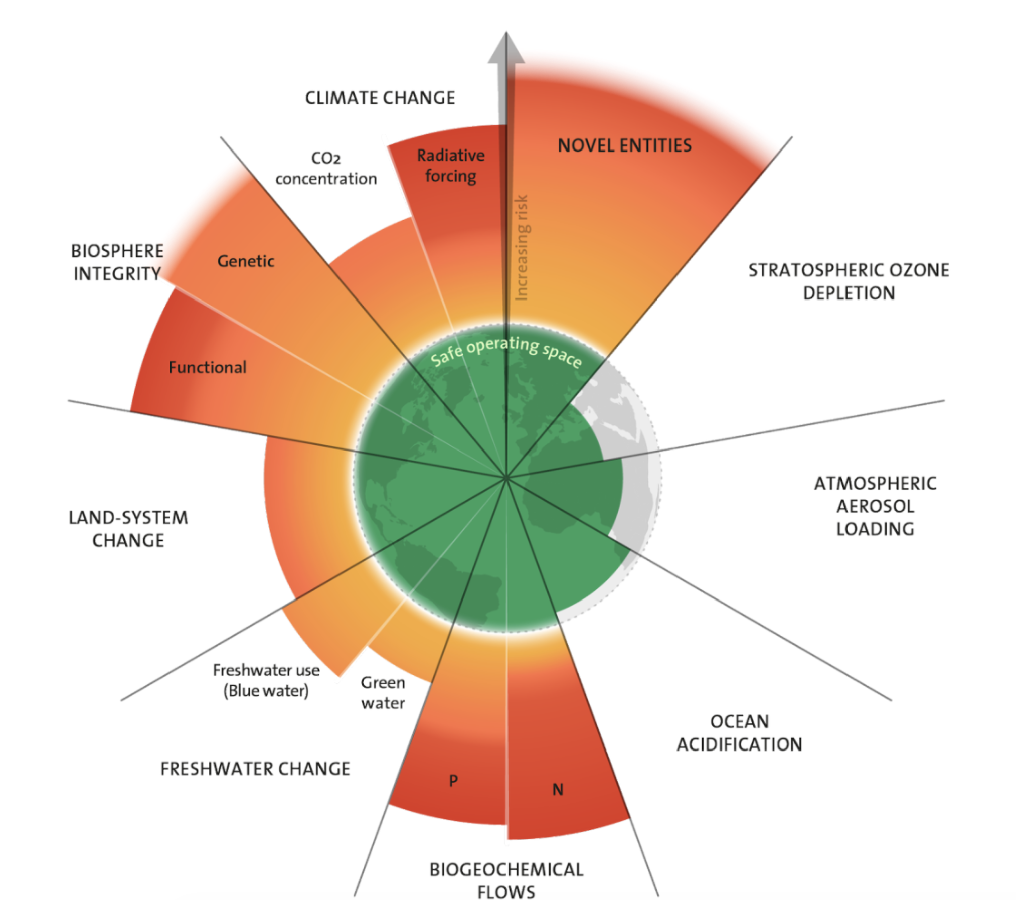 Novel Entities: Did you hear about the study showing microplastics in the bloodstream of 80% of the participants? Synthetic chemicals, microplastics, and genetically modified organisms are being introduced into the environment faster than we can assess their long-term impacts. This boundary is way beyond safe limits.